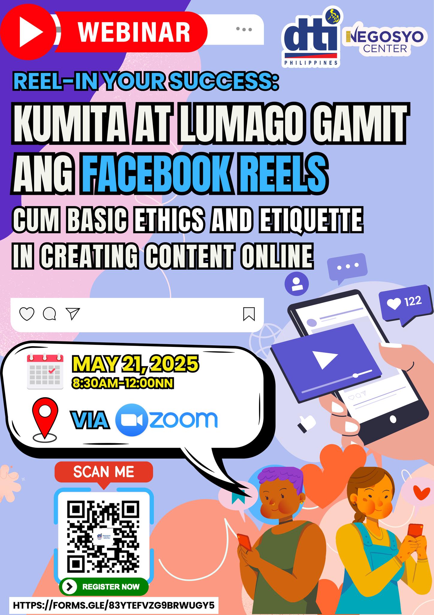 Sta.Cruz, Marinduque – Ang Department of Trade and Industry (DTI) Marinduque sa pamamagitan ng Negosyo Center Santa Cruz ay magdaraos ng webinar may pamagat “Reel-in Your Success: Kumita at Lumbago Gamit ang Facebook” kaugnay nito ang “Basic Ethics and Etiquette in making Content Online.: