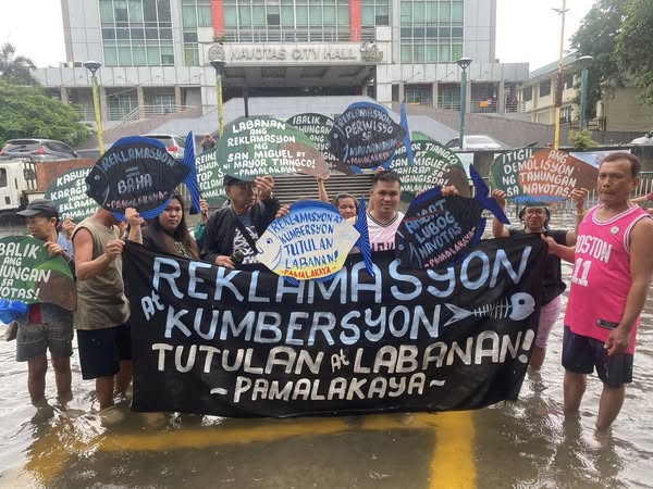 📷: Nagdaos ng kilos-protesta ngayong araw, Hulyo 23, ang maliliit na mangingisda sa ilalim ng Pamalakaya Navotas sa harap ng Navotas City Hall upang igiit ang agarang pagpapatigil sa nagpapatuloy na Navotas Coastal Bay Reclamation Project. Tinukoy ng grupo ang 650-ektaryang reklamasyon ng lokal na pamahalaan at San Miguel Corporation bilang pangunahing salik sa lumalala at matagalang pagbaha sa lungsod. (PAMALAKAYA | FB)