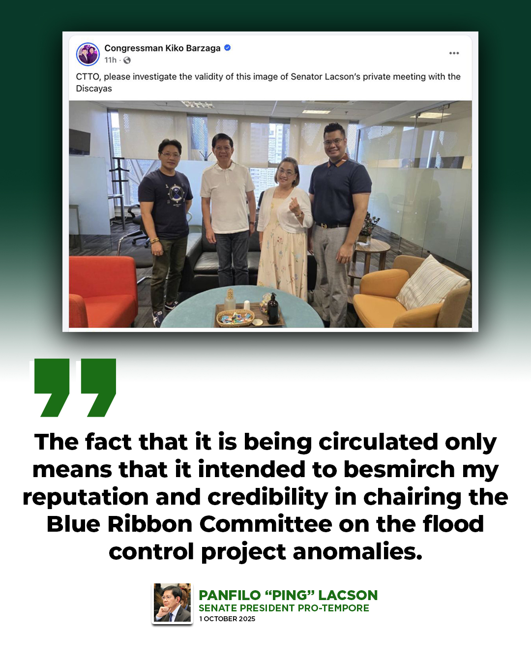 Ginagamit umano ang isang lumang larawan na nagpapakita kay Senate President Pro Tempore Panfilo “Ping” M. Lacson kasama ang mag-asawang Discaya upang siraan ang kanyang pamumuno sa imbestigasyon ng Senate Blue Ribbon Committee kaugnay ng mga iregularidad sa mga flood control project.