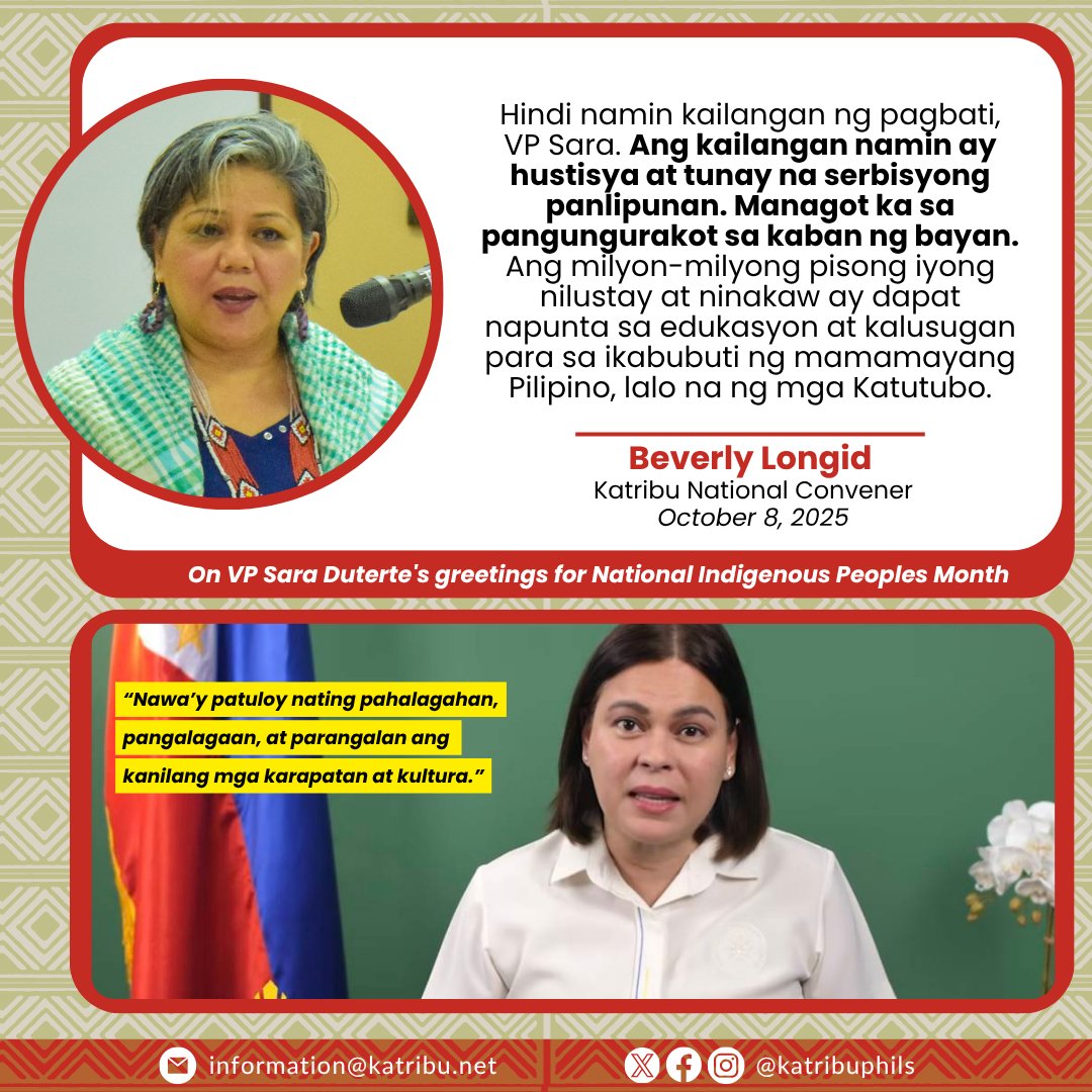 “Kaya hindi namin kailangan ng pagbati, VP Sara. Ang kailangan namin ay hustisya at tunay na serbisyong panlipunan. Managot ka sa pangungurakot sa kaban ng bayan. Ang milyon-milyong pisong iyong nilustay at ninakaw ay dapat napunta sa edukasyon at kalusugan para sa ikabubuti ng mamamayang Pilipino, lalo na ng mga Katutubo,” pagtatapos ng grupo. (ROSE NOVENARIO)