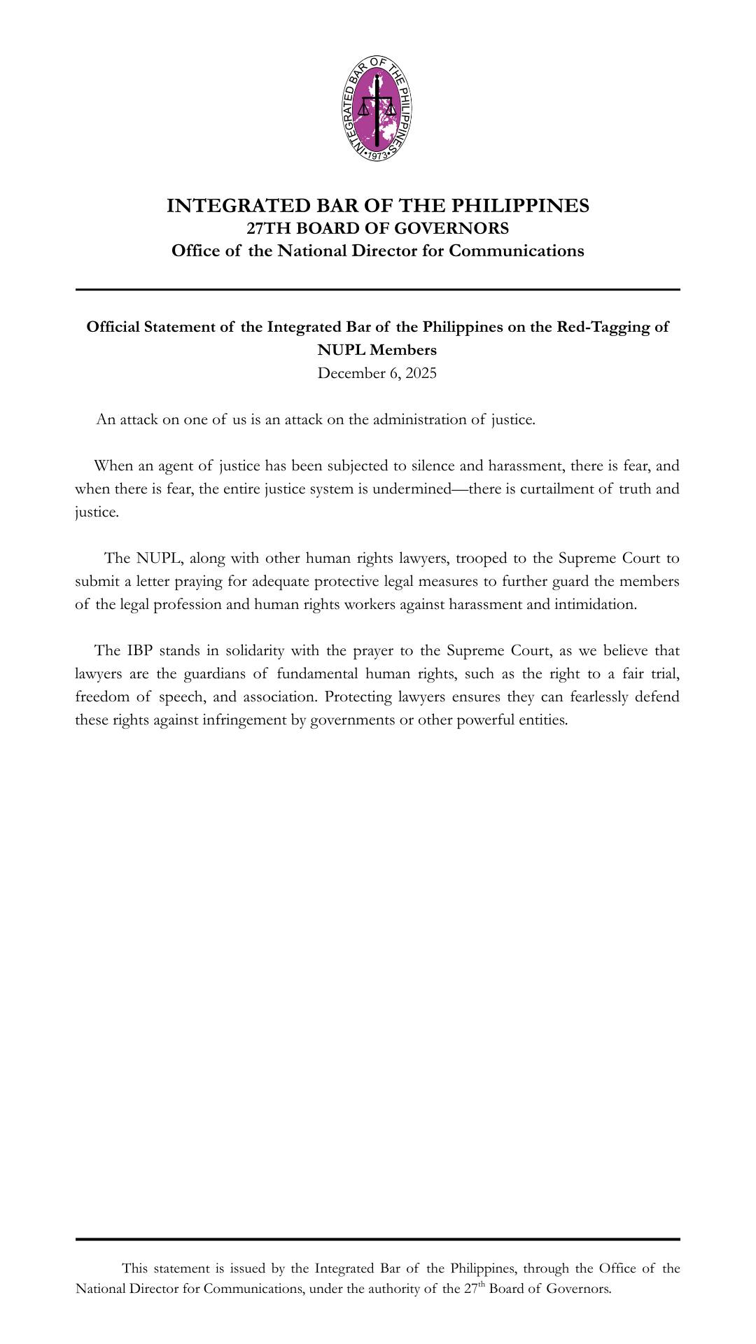 Mariing kinondena ng Integrated Bar of the Philippines (IBP) ang red-tagging laban sa mga miyembro ng National Union of Peoples’ Lawyers (NUPL), tinawag itong lantad na pag-atake sa rule of law at direktang pagtama sa puso ng hustisya.