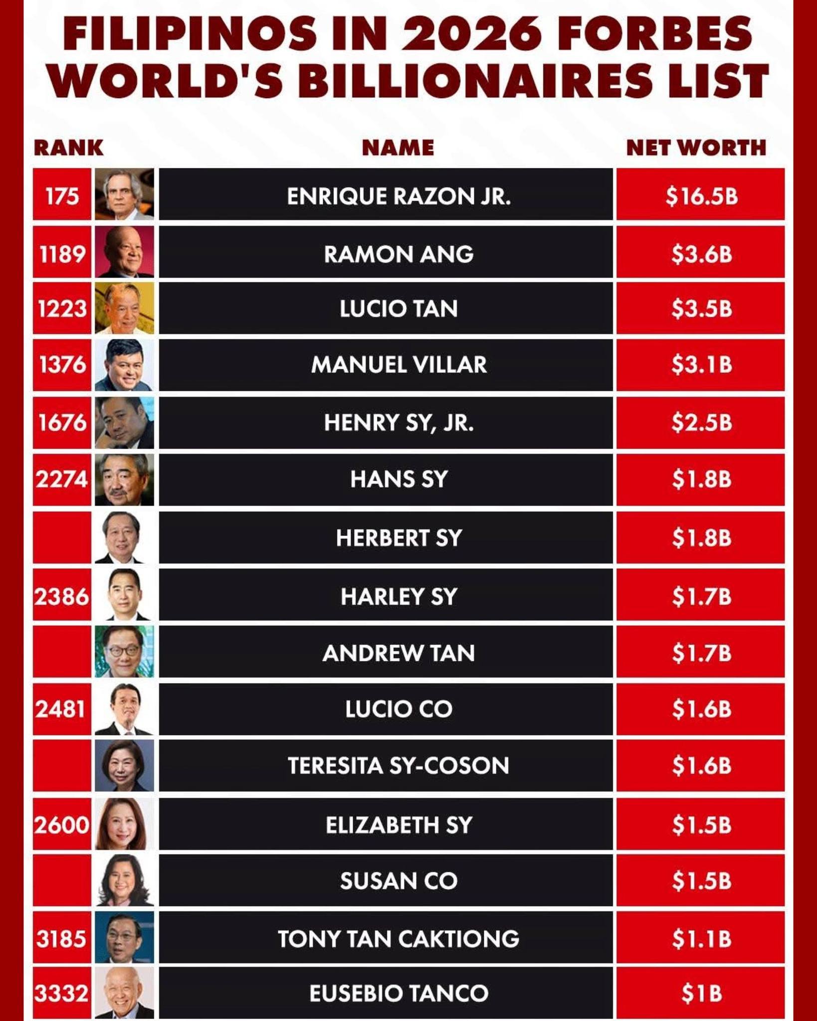Kabilang din sa listahan sina Ramon S. Ang ($3.6B), Lucio C. Tan ($3.5B), at Manuel B. Villar Jr. na bumagsak nang malaki sa $3.1B mula $17.2B dahil sa revaluation correction at insider-trading allegations. Anim na anak ni Henry Sy Sr. ay nananatiling nasa listahan, pinangungunahan ni Henry Sy Jr. ($2.5B) at Hans Sy ($1.8B). Kasama rin sina Andrew Tan ($1.7B), mag-asawang Lucio at Susan Co ($1.6B at $1.5B), Tony Tan Caktiong ($1.1B), at Eusebio Tanco ($1B).